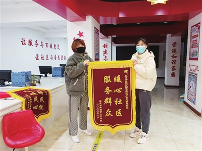 居民将锦旗送到社区工作人员手中