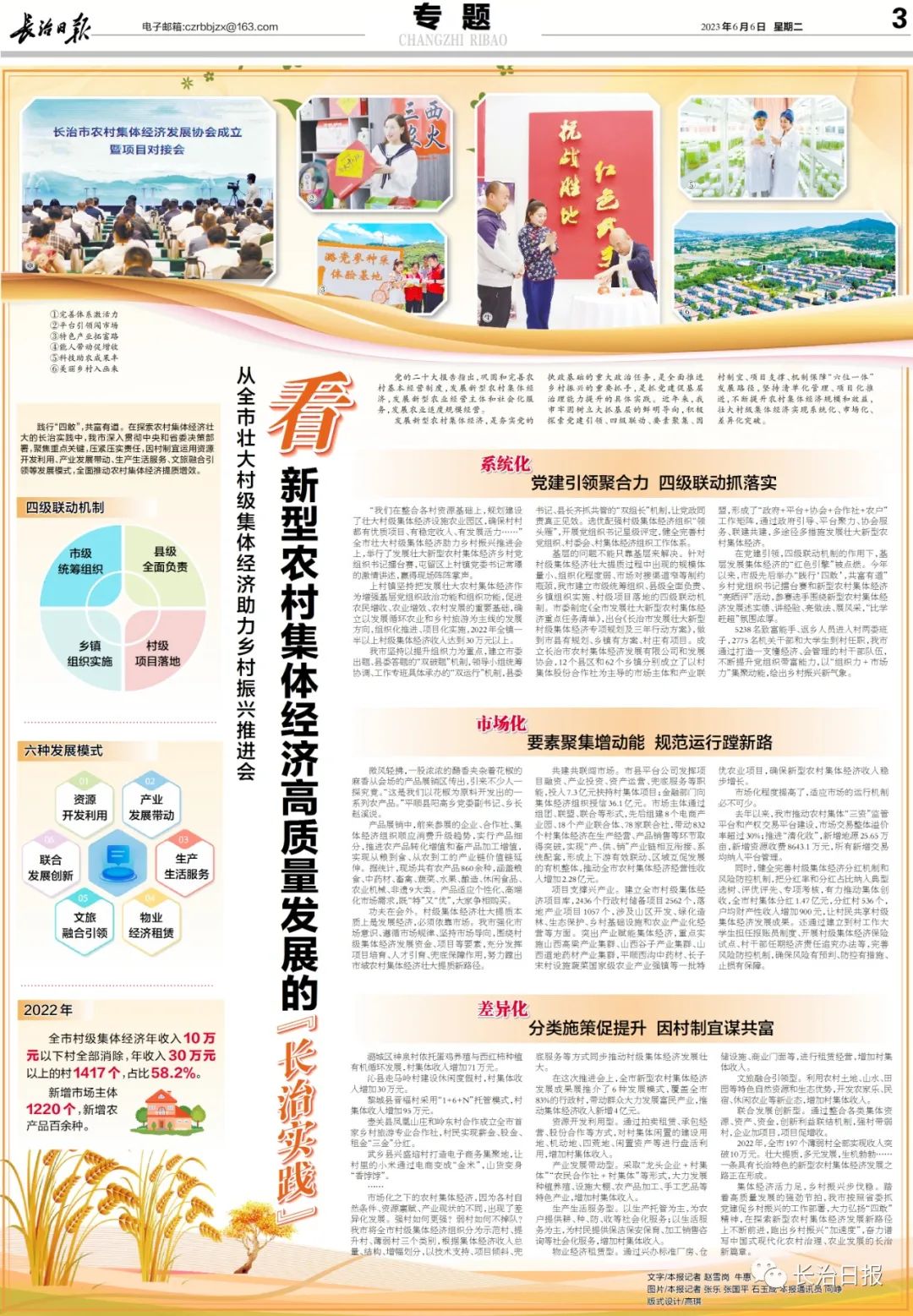 集体经济活力足,乡村振兴步伐稳。踏着高质量发展的强劲节拍,我市按照省委抓党建促乡村振兴的工作部署,大力弘扬“四敢”精神,在探索新型农村集体经济发展新路径上不断前进,跑出乡村振兴“加速度”,奋力谱写中国式现代化农村治理、农业发展的长治新篇章。