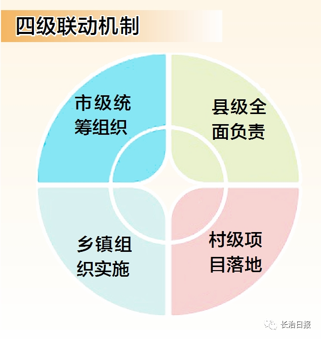 基层的问题不能只靠基层来解决。针对村级集体经济壮大提质过程中出现的规模体量小、组织化程度弱、市场对接渠道窄等制约瓶颈,我市建立市级统筹组织、县级全面负责、乡镇组织实施、村级项目落地的四级联动机制。市委制定《全市发展壮大新型农村集体经济重点任务清单》,出台《长治市发展壮大新型村级集体经济专项规划及三年行动方案》,做到市县有规划、乡镇有方案、村庄有项目。成立长治市农村集体经济发展有限公司和发展协会,12个县区和62个乡镇分别成立了以村集体股份合作社为主导的市场主体和产业联盟,形成了“政府+平台+协会+合作社+农户”工作矩阵,通过政府引导、平台聚力、协会服务、联建共建,多途径多措施发展壮大新型农村集体经济。