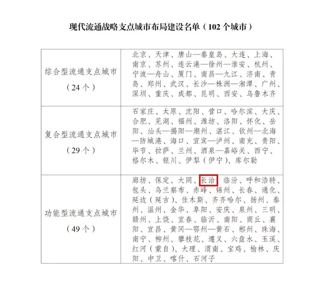 为贯彻党的二十大报告有关部署、落实《“十四五”现代流通体系建设规划》相关要求,推动构建高效顺畅的现代流通体系,近日,国家发展改革委会同自然资源部、交通运输部、商务部、市场监管总局印发《关于布局建设现代流通战略支点城市的通知》,部署现代流通战略支点城市布局建设工作。根据《通知》公布的名单,长治成功入选国家现代流通战略支点城市!《通知》坚持系统思维和全局观念,突出国家所需和城市所长,按照服务重要商品和资源要素流通、强化跨域跨界辐射带动、促进现代流通发展等三个维度布局流通支点城市。综合考虑城市资源禀赋、发展基础、比较优势、未来潜力,将102个城市纳入布局建设范围,覆盖全国31个省区市以及新疆生产建设兵团。流通支点城市将按综合型、复合型、功能型分类推进建设,城市人民政府发挥主体作用部署推进,努力提升自身发展水平,增强辐射带动作用。布局建设流通支点城市有利于更好发挥相关城市流通发展基础好、辐射带动能力强的优势,从“大流通”高度推动商流、物流、信息流、资金流融合发展,促进生产消费紧密衔接,加快形成内畅外联的现代流通网络,更好服务以实体经济为支撑的现代化产业体系。下一步,国家发展改革委将会同有关部门积极支持流通支点城市建设,及时协调解决跨部门、跨行业、跨区域问题,组织开展效果评估,宣传推广典型经验,以流通支点城市推动现代流通体系建设。