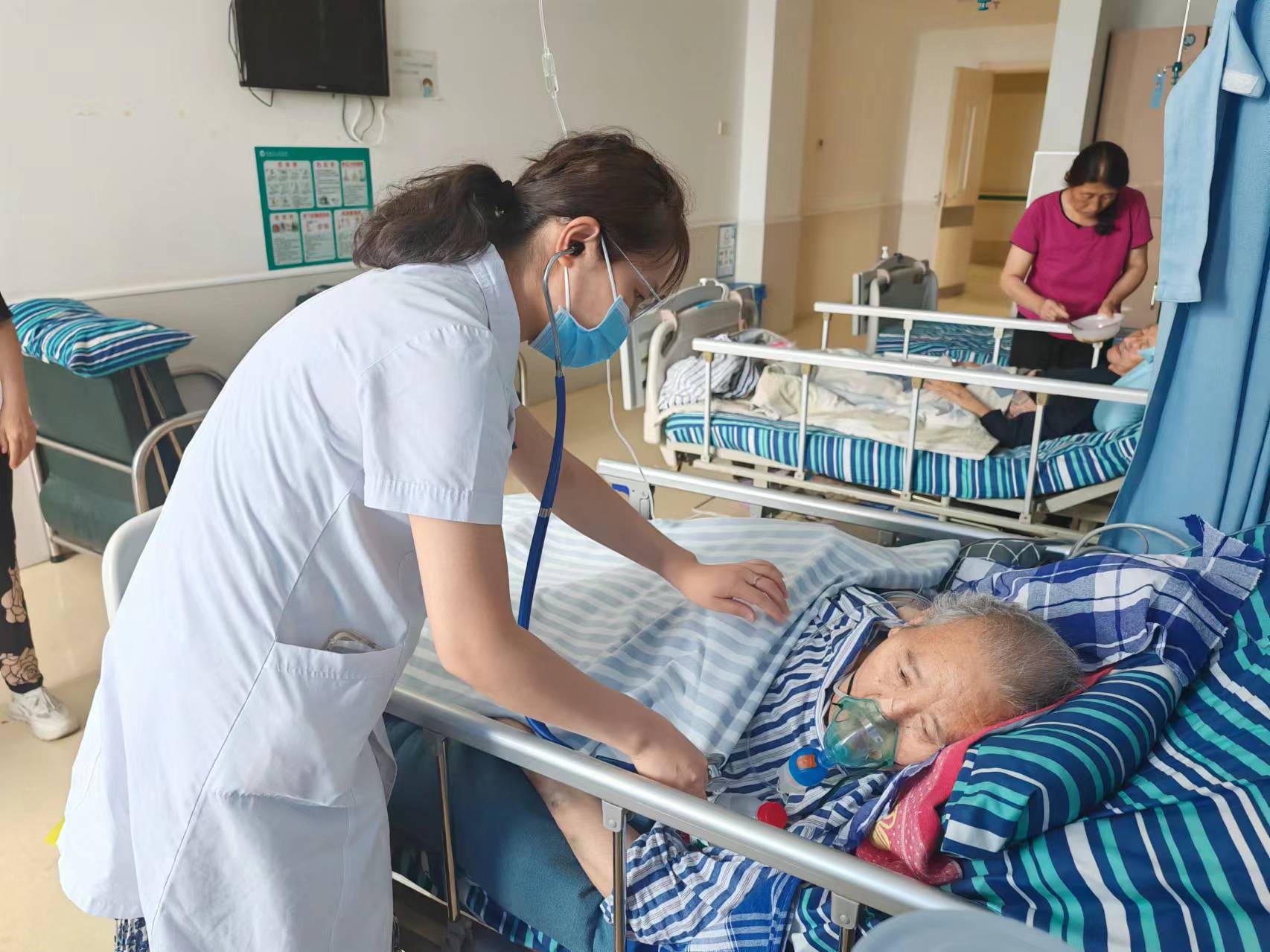 2024年春节期间,从医院ICU转入老年病科一位呼吸衰竭患者,多次下达病危通知书,生命体征极不平稳,患者生命危在旦夕。赵海娟医生没有退缩,凭借临床经验及仔细检查后,果断进行胸腔诊断性穿刺,联合胸外科医生,制订脓胸引流方案,从死神手中将患者抢救回来,患者病情逐渐稳定,跟踪治疗半年后,患者终于康复。