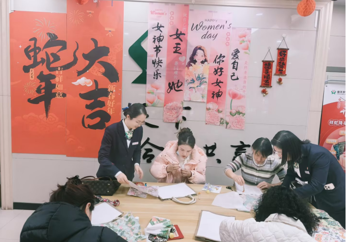 四家池支行以 “喜迎‘三八’真情回馈” 为主题,开展了手链 DIY 活动。活动现场,五彩斑斓的珠饰摆满桌面,客户们围坐在一起,专注地挑选心仪珠饰,精心编织着手链。大家一边相互交流编织技巧,一边分享生活趣事,在欢声笑语中尽情感受手工带来的无限乐趣。