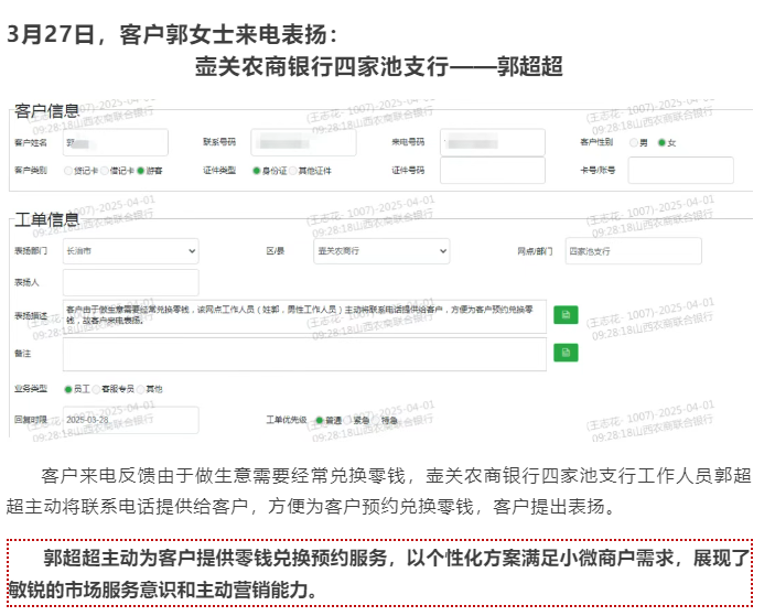 山西科技新闻网长治讯(秦爱国)近日,壶关农商银行四家池支行员工郭超超收到了一封来自山西农信客户服务中心的表扬工单。客户郭女士在来电中深情点赞“做生意零钱需求大,多亏小郭主动留电话帮我预约,真是解决了大问题!”这封工单不仅是对郭超超个人的赞誉,更是壶关农商银行坚守“金融为民”初心、深耕普惠服务的生动见证。