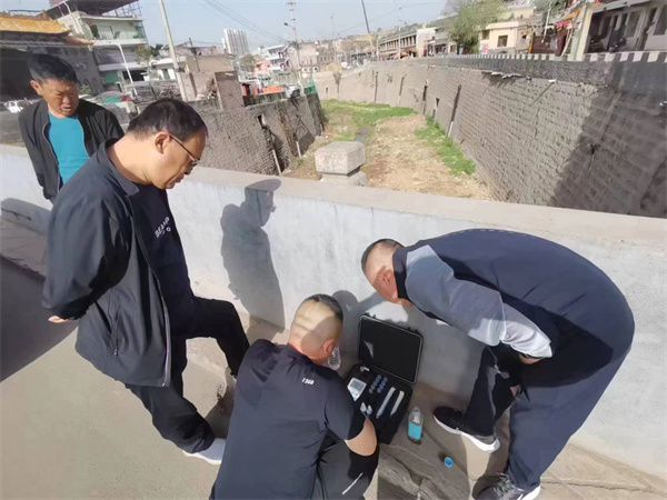 图为工作人员进行水质采样和实地调查