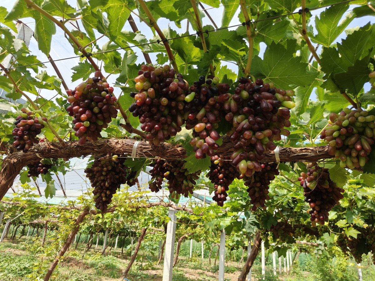 据介绍,金泽农业葡萄园占地110余亩,主要种植蓝宝石、夏黑、维多利亚等多个品种。园区采用水肥一体化和绿色防控技术,以植物源有机肥为主,确保了葡萄的产量和品质,产出的葡萄果穗匀称、汁多味甜、果香浓郁,深受市场青睐。
