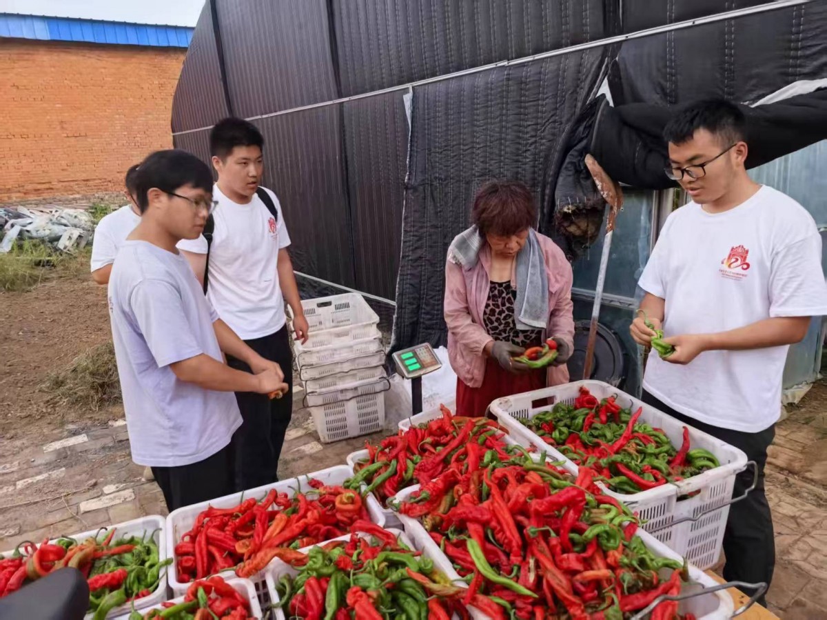在大堡头镇老马沟村君乐蔬菜种植家庭农场,一车残次青椒刚完成卸货,中国农大农酵小队成员就与县农业农村局特聘农技员一同现场指导农场主完成原料称重、配比、搅拌等流程,助力农场顺利制作第三批酵素。